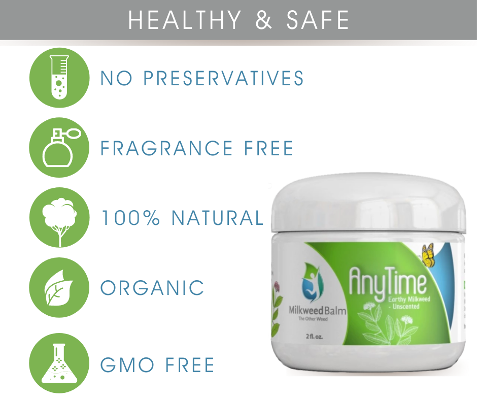 Keep enjoying the things you love with our original natural scented AnyTime Milkweed Balm. AnyTime is a natural cream filled with omega-7 fatty acids, anti-inflammatory agents, antioxidants, and electrolytes to help soothe your pain and hydrate skin. AnyTime cream is ideal for relieving aches and pains. Patented for Arthritis, Headaches- including Migraines, Fibromyalgia and Neuropathy, you will learn why the botanical name for milkweed plant was called Asclepias after the Greek god of healing.